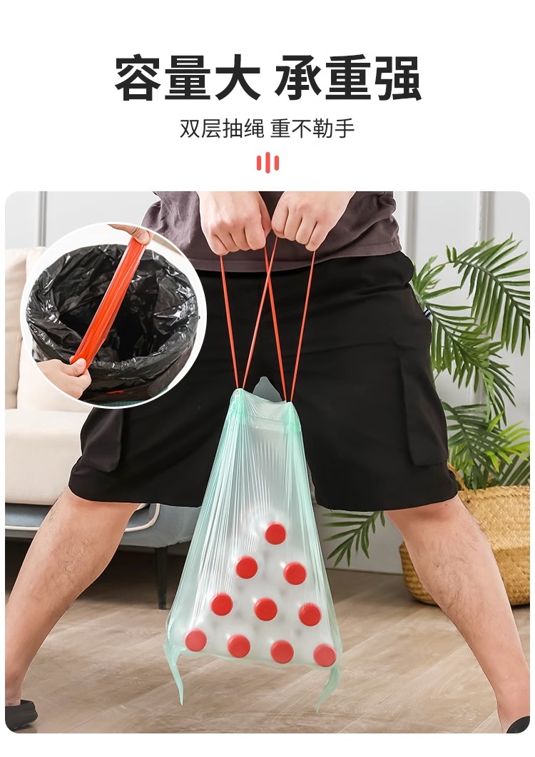 商品名称:抽绳收口垃圾袋家用手提式黑色加厚办公室厨房中大号实惠装塑料袋